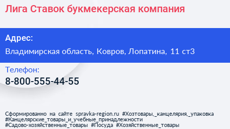 Лига Ставок, букмекерская компания по адресу Владимирская область, Ковров, Лопатина, 11 ст3 в дальнейшем Организация, размещена в следующих категориях: