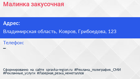 Малинка, закусочная по адресу Владимирская область, Ковров, Грибоедова, 123 в дальнейшем Организация, размещена в следующих категориях: