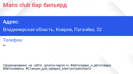 Mans club, бар-бильярд по адресу Владимирская область, Ковров, Пугачёва, 32 в дальнейшем Организация, размещена в следующих категориях: