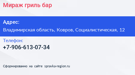Мираж, гриль-бар по адресу Владимирская область, Ковров, Социалистическая, 12 в дальнейшем Организация, размещена в следующих категориях: