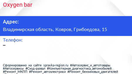 Oxygen-bar по адресу Владимирская область, Ковров, Грибоедова, 15 в дальнейшем Организация, размещена в следующих категориях: