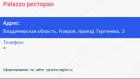 Palazzo, ресторан по адресу Владимирская область, Ковров, проезд Тургенева, 3 в дальнейшем Организация, размещена в следующих категориях: