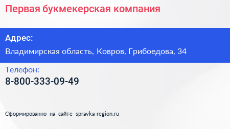Первая букмекерская компания по адресу Владимирская область, Ковров, Грибоедова, 34 в дальнейшем Организация, размещена в следующих категориях: