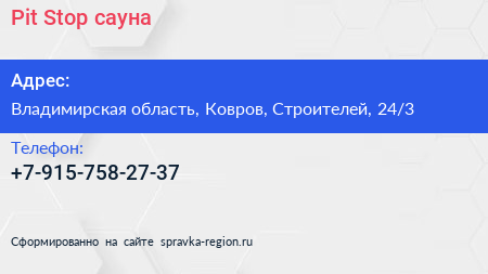 Pit-Stop, сауна по адресу Владимирская область, Ковров, Строителей, 24/3 в дальнейшем Организация, размещена в следующих категориях: