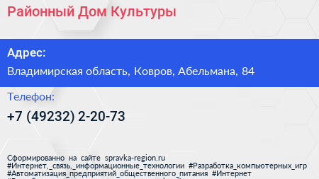 Районный Дом Культуры по адресу Владимирская область, Ковров, Абельмана, 84 в дальнейшем Организация, размещена в следующих категориях: