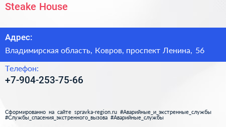 Steake House по адресу Владимирская область, Ковров, проспект Ленина, 56 в дальнейшем Организация, размещена в следующих категориях: