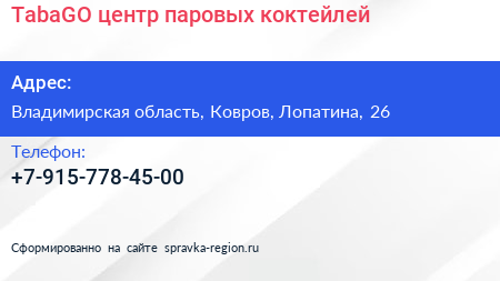 TabaGO, центр паровых коктейлей по адресу Владимирская область, Ковров, Лопатина, 26 в дальнейшем Организация, размещена в следующих категориях: