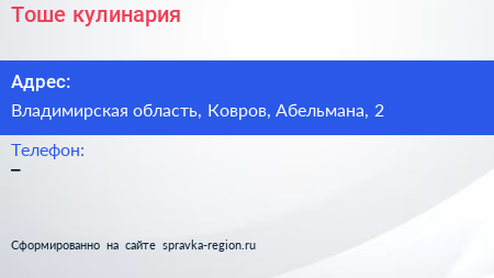 Тоше, кулинария по адресу Владимирская область, Ковров, Абельмана, 2 в дальнейшем Организация, размещена в следующих категориях: