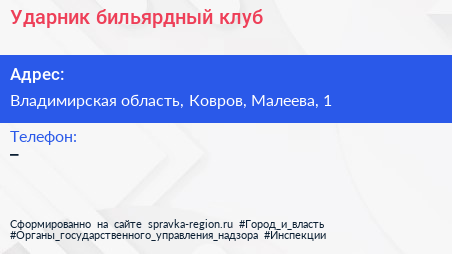 Ударник, бильярдный клуб по адресу Владимирская область, Ковров, Малеева, 1 в дальнейшем Организация, размещена в следующих категориях: