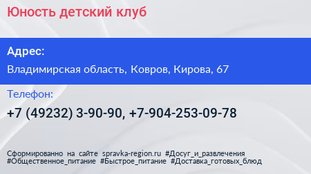 Юность, детский клуб по адресу Владимирская область, Ковров, Кирова, 67 в дальнейшем Организация, размещена в следующих категориях: