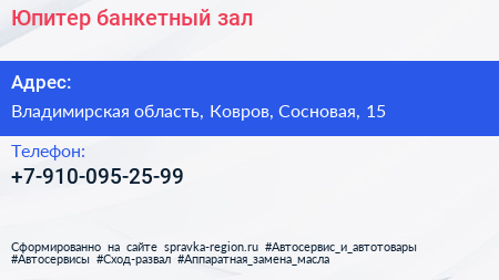 Юпитер, банкетный зал по адресу Владимирская область, Ковров, Сосновая, 15 в дальнейшем Организация, размещена в следующих категориях: