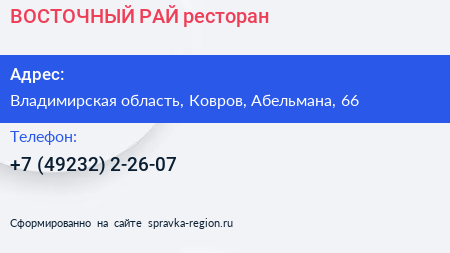 ВОСТОЧНЫЙ РАЙ, ресторан по адресу Владимирская область, Ковров, Абельмана, 66 в дальнейшем Организация, размещена в следующих категориях:
