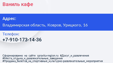 Ваниль, кафе по адресу Владимирская область, Ковров, Урицкого, 16 в дальнейшем Организация, размещена в следующих категориях: