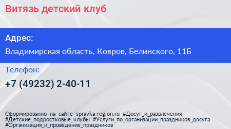 Витязь, детский клуб по адресу Владимирская область, Ковров, Белинского, 11Б в дальнейшем Организация, размещена в следующих категориях: