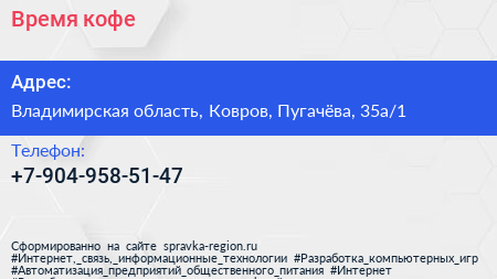 Время кофе по адресу Владимирская область, Ковров, Пугачёва, 35а/1 в дальнейшем Организация, размещена в следующих категориях: