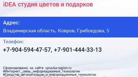 iDEA, студия цветов и подарков по адресу Владимирская область, Ковров, Грибоедова, 5 в дальнейшем Организация, размещена в следующих категориях: