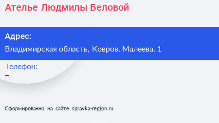 Ателье Людмилы Беловой по адресу Владимирская область, Ковров, Малеева, 1 в дальнейшем Организация, размещена в следующих категориях: