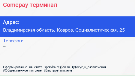 Comepay, терминал по адресу Владимирская область, Ковров, Социалистическая, 25 в дальнейшем Организация, размещена в следующих категориях: