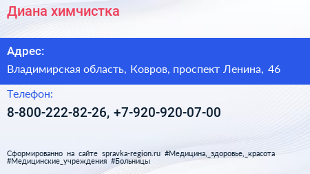 Диана, химчистка по адресу Владимирская область, Ковров, проспект Ленина, 46 в дальнейшем Организация, размещена в следующих категориях: