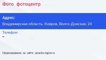 Фото+, фотоцентр по адресу Владимирская область, Ковров, Волго-Донская, 24 в дальнейшем Организация, размещена в следующих категориях: