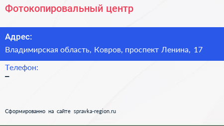 Фотокопировальный центр по адресу Владимирская область, Ковров, проспект Ленина, 17 в дальнейшем Организация, размещена в следующих категориях: