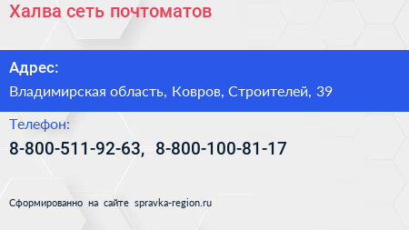 Халва, сеть почтоматов по адресу Владимирская область, Ковров, Строителей, 39 в дальнейшем Организация, размещена в следующих категориях: