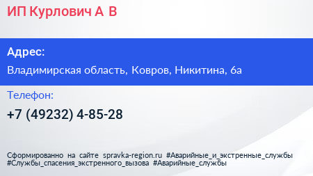 ИП Курлович А.В. по адресу Владимирская область, Ковров, Никитина, 6а в дальнейшем Организация, размещена в следующих категориях: