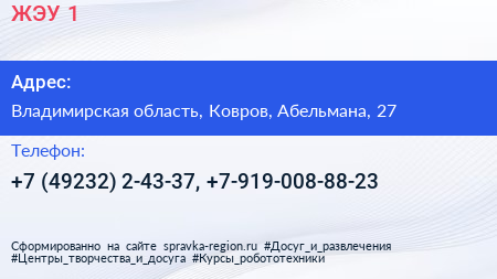 ЖЭУ-1 по адресу Владимирская область, Ковров, Абельмана, 27 в дальнейшем Организация, размещена в следующих категориях: