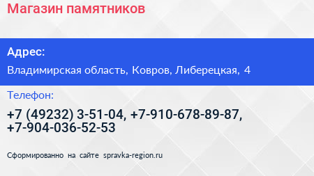 Магазин памятников по адресу Владимирская область, Ковров, Либерецкая, 4 в дальнейшем Организация, размещена в следующих категориях:
