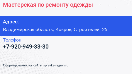 Мастерская по ремонту одежды по адресу Владимирская область, Ковров, Строителей, 25 в дальнейшем Организация, размещена в следующих категориях: