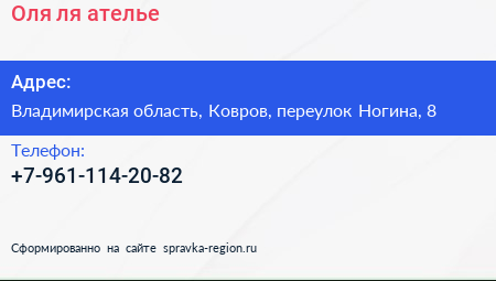 Оля-ля, ателье по адресу Владимирская область, Ковров, переулок Ногина, 8 в дальнейшем Организация, размещена в следующих категориях: