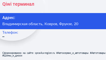 Qiwi, терминал по адресу Владимирская область, Ковров, Фрунзе, 20 в дальнейшем Организация, размещена в следующих категориях: