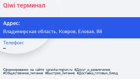 Qiwi, терминал по адресу Владимирская область, Ковров, Еловая, 88 в дальнейшем Организация, размещена в следующих категориях: