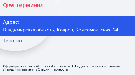 Qiwi, терминал по адресу Владимирская область, Ковров, Комсомольская, 24 в дальнейшем Организация, размещена в следующих категориях: