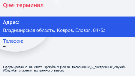 Qiwi, терминал по адресу Владимирская область, Ковров, Еловая, 84/5а в дальнейшем Организация, размещена в следующих категориях: