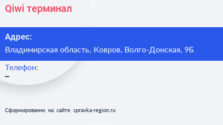 Qiwi, терминал по адресу Владимирская область, Ковров, Волго-Донская, 9Б в дальнейшем Организация, размещена в следующих категориях: