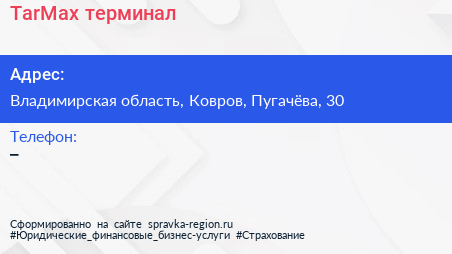 TarMax, терминал по адресу Владимирская область, Ковров, Пугачёва, 30 в дальнейшем Организация, размещена в следующих категориях:
