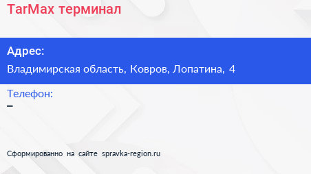 TarMax, терминал по адресу Владимирская область, Ковров, Лопатина, 4 в дальнейшем Организация, размещена в следующих категориях: