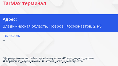 TarMax, терминал по адресу Владимирская область, Ковров, Космонавтов, 2 к3 в дальнейшем Организация, размещена в следующих категориях: