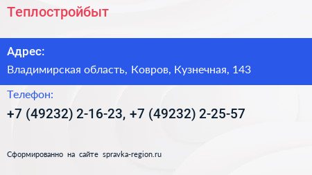 Теплостройбыт по адресу Владимирская область, Ковров, Кузнечная, 143 в дальнейшем Организация, размещена в следующих категориях: