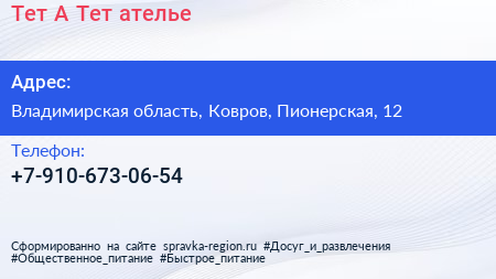 Тет-А-Тет, ателье по адресу Владимирская область, Ковров, Пионерская, 12 в дальнейшем Организация, размещена в следующих категориях: