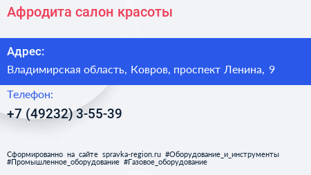 Афродита, салон красоты по адресу Владимирская область, Ковров, проспект Ленина, 9 в дальнейшем Организация, размещена в следующих категориях: