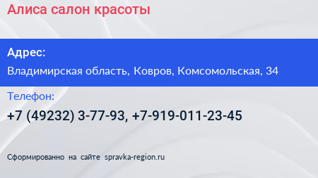 Алиса, салон красоты по адресу Владимирская область, Ковров, Комсомольская, 34 в дальнейшем Организация, размещена в следующих категориях: