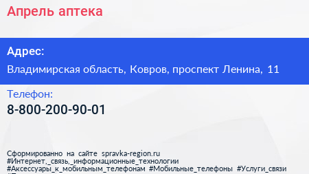 Апрель, аптека по адресу Владимирская область, Ковров, проспект Ленина, 11 в дальнейшем Организация, размещена в следующих категориях: