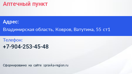 Аптечный пункт по адресу Владимирская область, Ковров, Ватутина, 55 ст1 в дальнейшем Организация, размещена в следующих категориях:
