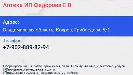 Аптека, ИП Федорова Е.В. по адресу Владимирская область, Ковров, Грибоедова, 5/1 в дальнейшем Организация, размещена в следующих категориях: