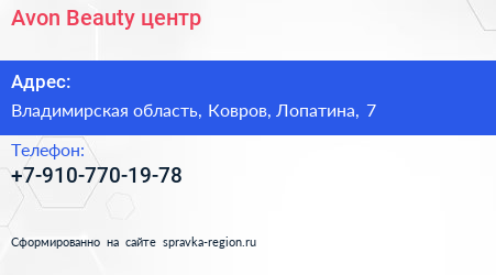 Avon Beauty, центр по адресу Владимирская область, Ковров, Лопатина, 7 в дальнейшем Организация, размещена в следующих категориях:
