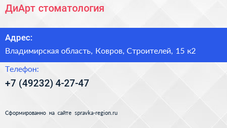 ДиАрт, стоматология по адресу Владимирская область, Ковров, Строителей, 15 к2 в дальнейшем Организация, размещена в следующих категориях: