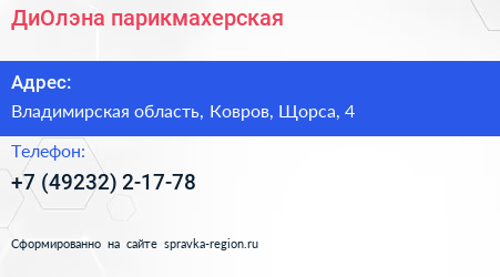 ДиОлэна, парикмахерская по адресу Владимирская область, Ковров, Щорса, 4 в дальнейшем Организация, размещена в следующих категориях: