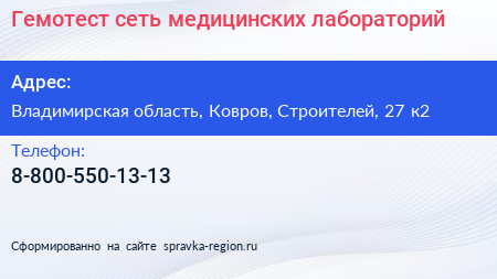 Гемотест, сеть медицинских лабораторий по адресу Владимирская область, Ковров, Строителей, 27 к2 в дальнейшем Организация, размещена в следующих категориях: